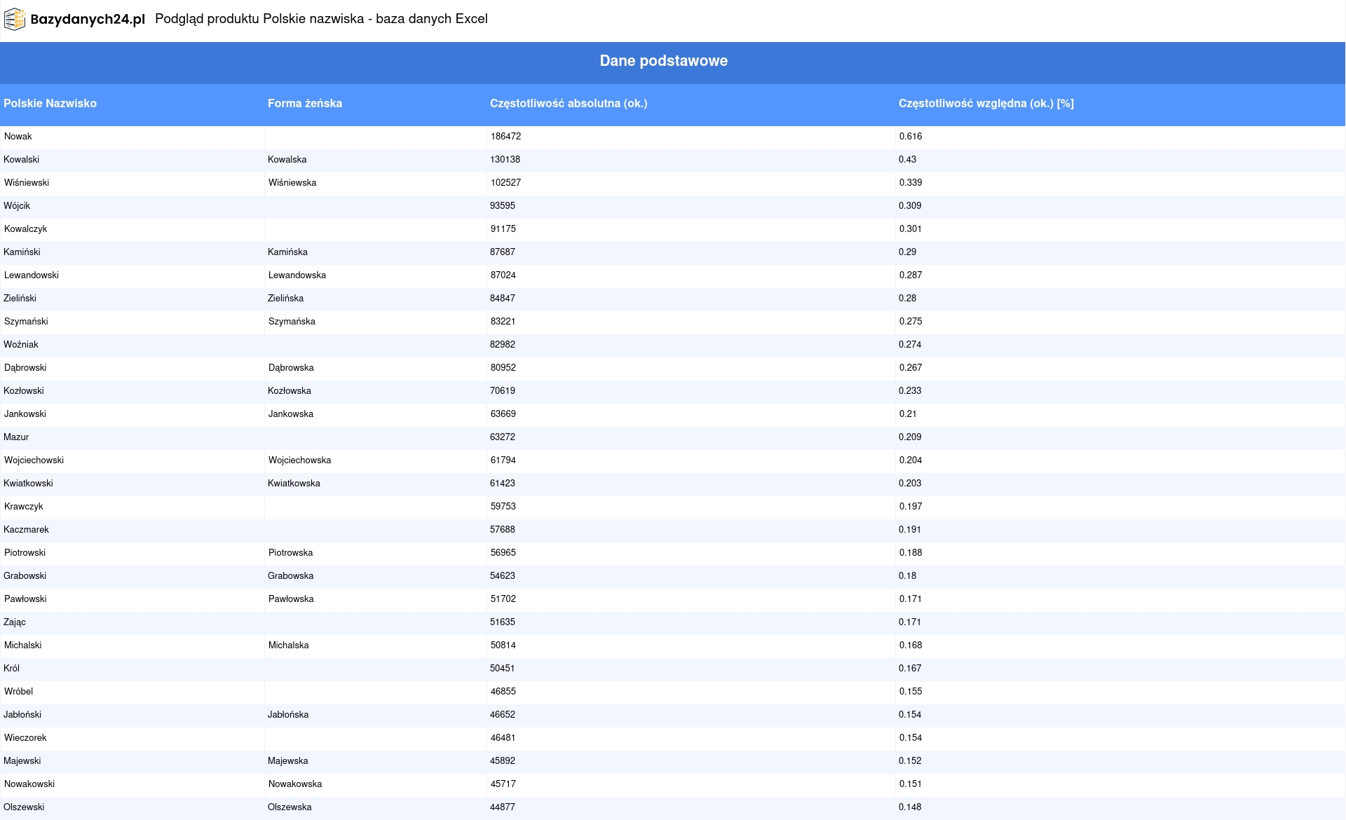 Nasza baza danych zawiera polskich nazwisk starannie zebranych i skatalogowanych. Lista obejmuje najczęstsze polskie nazwiska wraz z formami żeńskimi oraz danymi o ich częstotliwości występowania. Dane dostarczane są w praktycznym formacie Excel, który można łatwo filtrować i przetwarzać w systemach CRM, narzędziach marketingowych lub innych bazach danych.