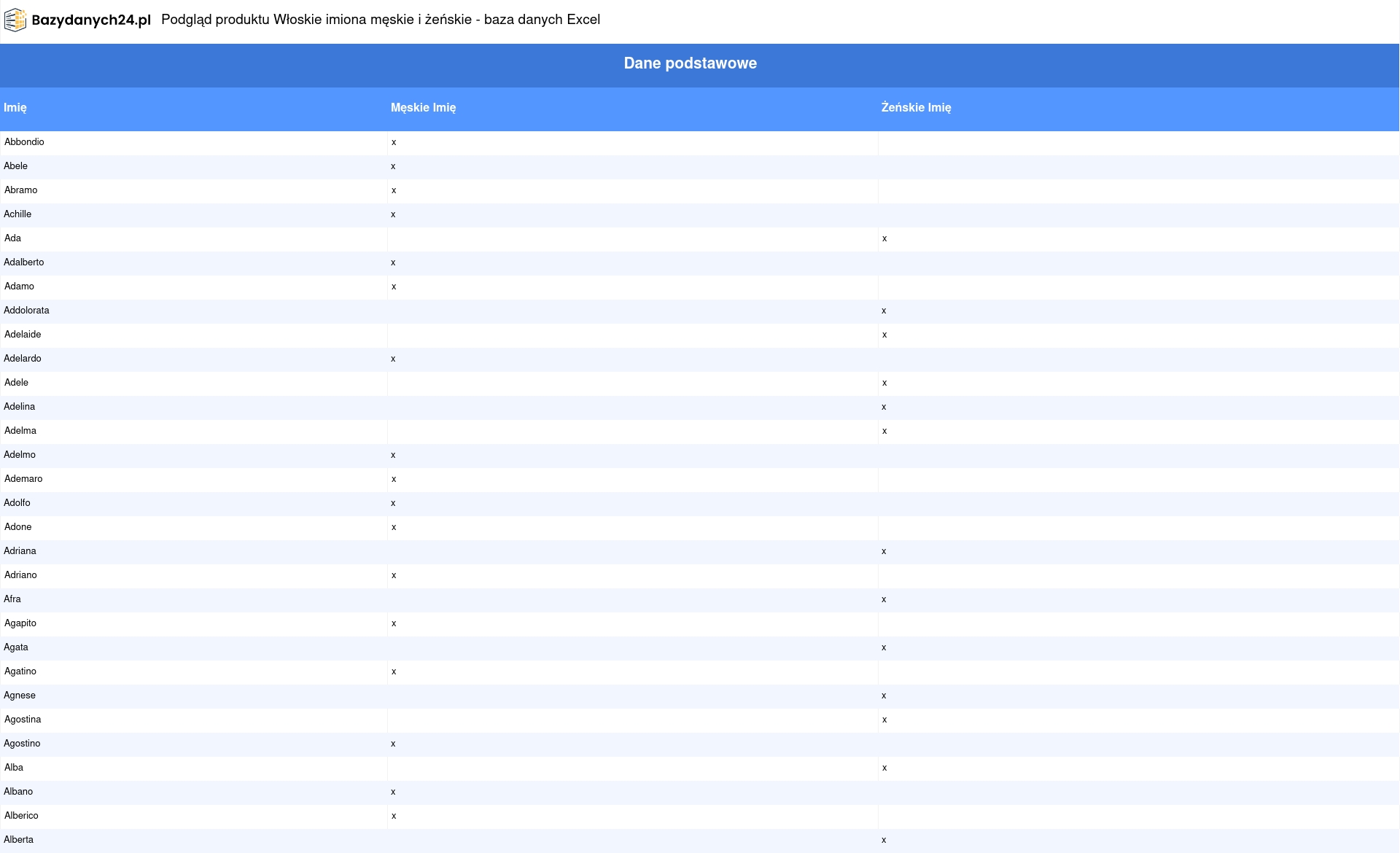 Włoskie imiona męskie i żeńskie - baza danych Excel
